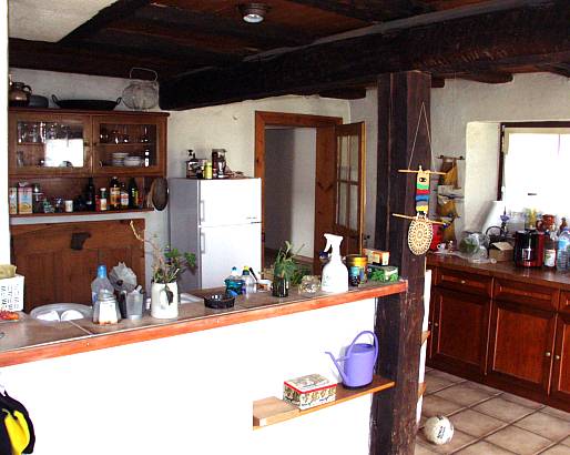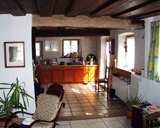 In diesem Haus ist die große helle WohnKüche mit SeitenAusgang zum Freisitz das Zentrum. Gegenüber der Küche befindet sich ein GästeZimmer. Im NordAnbau ist das kleine, gemütliche Bad untergebracht. Unter der Küche befindet sich eine TeilunterKellerung, die zwar nur 1,60m hoch ist, sich aber durch die NatursteinMauerung gut als Wein- und GemüseKeller eignet.