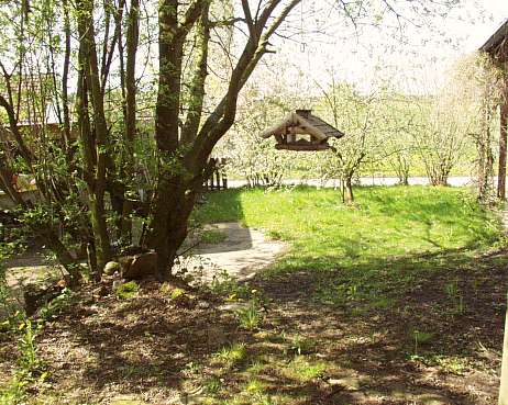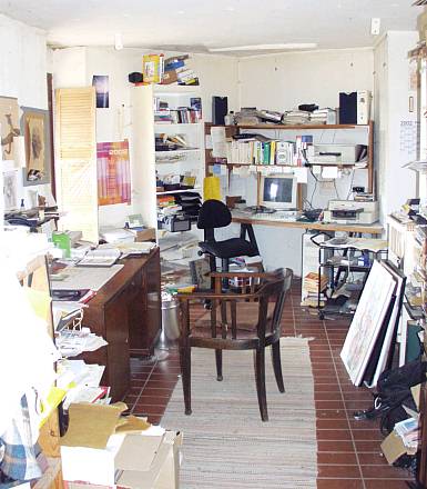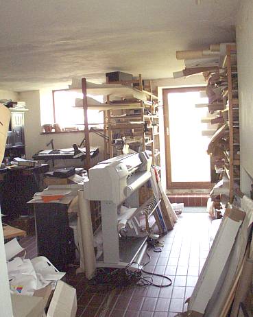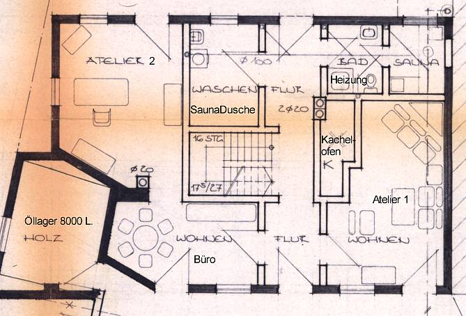 Plan des Erdgeschosses. Das Haus ist ca. 14 m breit und 10 m tief. Der vordere und linke Teil wird zur Zeit noch als Atelier- und ArbeitsRaum genutzt, im hinteren Teil Sauna, HeizZentrale, Wäschehänge, im großen Badezimmer Waschmaschine, Trockner, Waschbecken, Toilette und große SaunaDusche mit Schwallbrausen etc.. Das ÖlLager links bildet das "Scharnier" zum Garagen- und WerkstattAnbau. Es können 8000 Liter Öl in 4 Tanks "gebunkert" werden, sodass das Haus bis zu 4 Jahre versorgt ist und der Öleinkauf nach Preislage erfolgen kann. Das Haus verfügt zusätzlich über einen zentralen Kachelofen und im OberGeschoss über einen offenen Kaminofen, der exzellent brennt (nicht immer üblich). Das Haus hat 3 separate Schornsteine. |