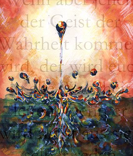 As a metaphor of the incidence, that happend at pentecostes, I have chosen scientific high speed photographs of what happens, if one fluid, falling from big height on the surface of another fluid. For a moment there is strong movement and "Chaos". Not only on but also below the surface. After that the movement spreds circular on the surface, but it also spreds under the surface – the penetrating fluid is diffusing and may have a lasting effect on the other fluid. In the moment of the strike one trop, often mixed out of both fluids, is getting tossed exactly in the center. - Interpretation ad libidum.... | |||||||||