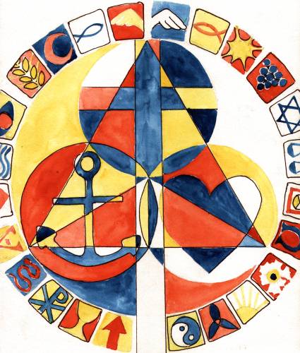 Developing and painting of the motif "Trinuity" required a certain mannor of "artistic humility": the painting is wittingly designed imperfect, as well as the sight of a human being on that what we call "Trinity" allways will (and must) stay imperfect. In the opposite there is the circle as dominant detail of the composition, a symbol of infinity and perfection. The primary colours yellow, blue and red symbolize the fundamental relevance of "trinity" for the christian religiosity. These three colours are continued in the surrounding "circle of live and earth" - "For of him, and through him, and to him, are all things..." (Romans11,36). Added and included are the symbols of another basical christian trinity: faith, love and hope. | ||||