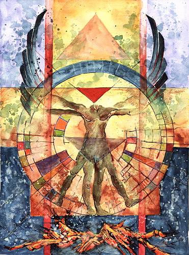 With this painting I want to show an alternative to the common sense of "compassion": the need for help is symbolized with the broken wing at the bootom - but as a symbol of hope: a broken "phenix" with the colours of fire and the ability to revive reradiating. This metaphor wants to lead away from the discracefull meaning of a "victim". Above this the helper: not a careworn "compassioneer", but a strong figure with many abilities and possibilities, symbolized by the spectrum of colours in his circle of agitations. The triangles sysmbolize the intensions. The main motif was developed allready some years ago for the series "We are the Angels" with the title: "doing my best for you". | ||||||||