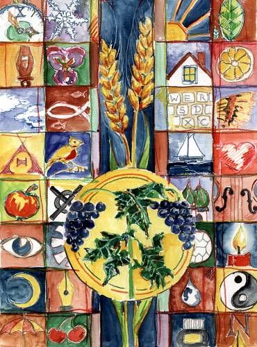 Some remarks by the painter: In the center of this painting I have placed two motifs, often used in biblical parables. On both sides these motifs are flanked by a mosaic of details, symbolizing al those everysay things, we only notice parenthetically and (too?) often not as a reason for thankfullness. this motif has a funny stylistic pendant in the series "Golf Art": "Several instruments to hit a white little ball". | |||||||