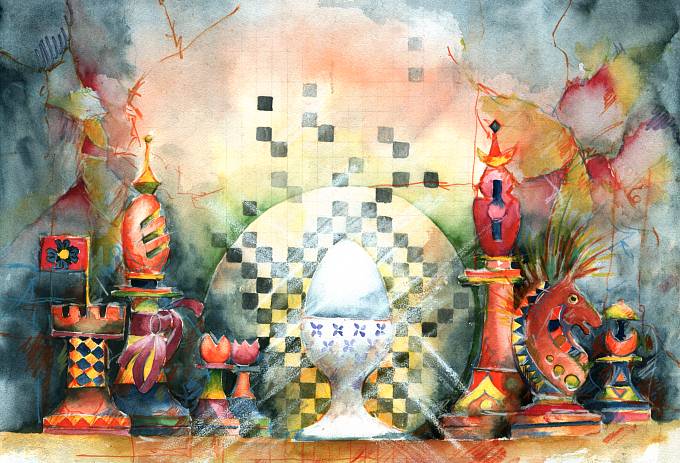 Wenn mir ein Thema gefällt und/oder mich stärker beschäftigt, male ich nicht nur ein Bild darüber, sondern gerne auch mehrere Versionen - in anderer Form oder mit neuen Details (wie zum Beispiel beim Thema "Goldberg-Variationen" in der Musik-Serie). Weitere Versionen dieses Motivs finden Sie in der Serie "Schachparabeln" / If I really like a special theme, I draw several versions of it. With different interpretations or additional details (as, for example, the theme "Goldberg Variations" of the "Music Series". More versions of this theme you can find on the pages of "chess metaphors". | |||