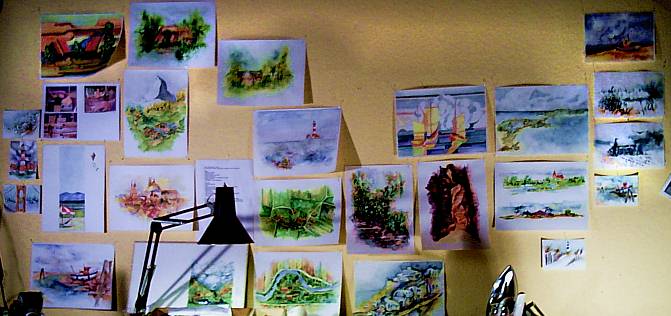 Das neue Jahr beginnt, wie das alte aufhörte: mit der Arbeit am Folgeband der Serie "Abenteuer Aquarell". Das Thema: "Landschaften". An der Wand über meinem Arbeitsplatz sammeln sich Entwürfe und Studien (Bild oben), die jeweils nach Fertigstellung umgehend per E-Mail an Redaktion und Verlag verschickt und von dort oft ebenso umgehend kommentiert werden - unsere Telefon-Flatrate ermöglicht die regelmäßige "Kleine Redaktionskonferenz", die Distanz von über 800 Kilometern schmilzt auf einen Knopfdruck. Dezent hinter dem Lampenschirm verborgen: die "Wunschliste" der Redakteurin, mit den Details, die sie gerne im Buch, respektive in den Motiven eingearbeitet sehen würde. Bleibt da überhaupt noch Raum für meine Kreativität? Mehr als genug! Gerade die komplexe Aufgabenstellung erfordert ein hohes Maß an gestalterischen Ideen und Flexibilität, auch wenn sich die Motive meistens deutlich von meinen sonstigen Arbeiten unterscheiden - schließlich geht es hier um möglichst vielseitige und nachvollziehbare Kurse für ambitionierte Laien und nicht um das "ungebremste" Ausleben meines künstlerischen Egos. Das darf sich dann wieder in den drei für dieses Jahr geplanten "eigenen" Serien entfalten. Für die Serie "Abenteuer Aquarell" jedoch ist Konzeption und Didaktik gefragt, auch wenn das dem Uneingeweihten im Entstehungsprozess zuweilen etwas chaotisch anmuten könnte: | |||