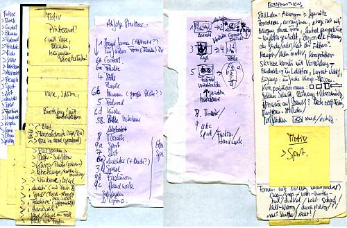 Oben abgebildet das Grundkonzept für den mittlerweile bereits erschienenen Band "StillLeben". Entworfen hatte ich alles auf hoher See während des Überführungstörns im Juli/August 2006 - aber alles befand sich noch "virtuell" in einem Eckchen meines Gehirns (das funktioniert so ähnlich wie "Blind-Schach" ohne Brett und Figuren), da sich während dieser Seefahrt keine Gelegenheit fand, einmal für mehrere Stunden ungestört und konzentriert arbeiten zu können, um alles systematisiert und übersichtlich geordnet "analog" aufzuschreiben. Diese Gelegenheit fand sich dann, nachdem unsere "MSY Unity" sicher im französischen Port Napoleon an der Rhonemündung am Steg vertäut war und ich eineinhalb Tage lang mit der Fähre von Venedig nach Korfu übersetzte, um unser Wohnmobil nachzuholen. Einzige Schwierigkeit: auf dem ganzen großen (griechischen) Schiff war anscheinend kein einziges Blatt Papier zu finden - zumindest wurde ich von Steward und Rezeption mit dieser Auskunft beschieden - etwas schreiben zu wollen schien als reichlich exotisches Ansinnen eingestuft zu werden, sodass mich sogar einige argwöhnische Blicke streiften. Not macht erfinderisch: das gesamte Konzept des Buches entstand nun eben auf der Innenseite eines halben Zigarettenkartons, den ein Barmann mir aus seinem Abfall fischte und auf einem alten Briefumschlag, gespickt mit Duzenden von gelben Haftnotizzetteln, die ich zum Glück noch in meinem Rucksäckchen fand. Beruhigende Erkenntnis dieses Experiments: Manches geht auch heute noch ohne Hochleistungs-Notebook und andere HiTec-Accessoires. Aktuell ist mir nun jedoch ein "richtiger" Arbeitsplatz in unserem neuen Zuhause in Garding vergönnt. | |||