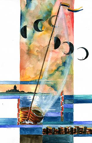 Bleibt also der Mond. Der ist am Himmel, also oben und da es ohne ihn vermutlich gar keine Tide (so heißen Ebbe und Flut auf Nordfriesisch) gäbe, bekommt er die obere Hälfte des Doppelbildes. Zusammen mit dem Wind, der ja nicht nur unten, sondern auch etwas höher weht. Die Meteorologen nennen das dann "Höhenwind". Dahin reicht zwar eigentlich das Segel eines Ewers nicht wirklich, aber das ist ja auch nur symbolisch zu verstehen. Genau so wie der "heiße" Himmel. Schön "chaotisch", weil die Natur eben so ist. Was heißt eigentlich "chaotisch"? Damit bezeichnen wir alles, was nicht "schön sauber" in Reih und Glied aufgestellt ist, so wie wir Menschen das eben gerne hätten. Wir verstehen das Chaos nicht so richtig und deshalb mögen es einige gar nicht. Oder es wurde "Gott" genannt. Den versteht zwar auch keiner so richtig, aber der ist gut. Hört man zumindest sagen. Vorzugsweise sonntags in der Kirche. Alle reden vom "lieben Gott". Aus Furcht, dass sonst keiner mehr in die Kirche kommt? Stimmt zwar so nicht - und das haben wir nun davon: Klimakatastrophe! Steht allerdings ganz offen in der Bibel: "Gott lässt sich nicht spotten!". Wer spottet? Ignoranz und Oberflächlichkeit. Jetzt plötzlich kommt der "strafende Gott" selbst in den Medien vor. Dabei steht in der Bibel schon seit Jahrtausenden ganz deutlich, dass sich nur rächt, was wir "spotten". Und was in den letzten Jahrzehnten ablief, spottet ja nun auch ziemlich vielem. Gehandelt wurde nach dem Motto "Wir versaufen unsrer Oma ihr klein Häussche". Rheinischer Frohsinn global.