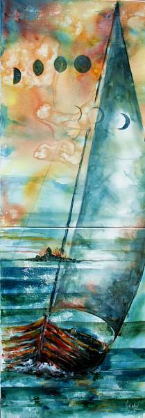 Eines jedenfalls weiß ich sicher: Ebbe und Flut haben mit Zunahme und Abnahme des Mondes zu tun. "Mond" also soll ins Bild. Möglichst in Bewegung und in symbolischen "Phasen". Und Garding. Ja, unsere neue Heimat muss auch mit ins Bild. Zumindest der "Kirchberg", damit auch Elisabeth mittelbar und symbolisch im Bild vertreten ist. Der Kirchberg von Garding ist fachmännisch ausgedrückt ein "Geest-Rücken". Deshalb muss er auch nicht Bergeshöhe aufweisen. Für einen Geestrücken reichen elf Meter über dem "Normalnull" des Meeresspiegels. Damit überragt er unser Haus deutlich, da unsere Haustür nur einen Meter und sechzig Zentimeter über diesem Normalnull liegt. Der Stil? Vordergründig traditionell. Gegenständlich, "handwerklich". Was man ja gar nicht so sagen dürfte, weil dann gleich wieder ein selbsternannter Schlaumeier was von "Kunsthandwerk" brabbelt. Soll er doch. Er will eben, dass im Vordergrund nichts, zumindest nichts "Handwerliches" sei, damit er ungebremst mit seiner platten Nase darauf gestoßen werde, dass da ein "Hintergrund" sein müsse - vorzugsweise intellektuell. Sonst bleibt er nämlich dran hängen - am Handwerk. So argwöhnt er zumindest und weil er das für sich argwöhnt schließt er scharfsinnig, dass er das auch für alle anderen argwöhnen dürfe. So viel zu Schlaumeiern, Bildbetrachtung, "Moderne" und Handwerk. Mein Bild soll jedenfalls so "harmlos" und nett aussehen, wie für viele die Halbinsel Eiderstedt aussieht - und der gedankliche Hintergrund meines Bildes noch immer auszusehen scheint oder zumindest über (zu) viele Jahre aussah. (Nota bene: Ich hatte im vorherigen Absatz nicht erwähnt, mein Bild hätte keinen "Hintergrund" - ich äußerte nur, "handwerklich" malen zu wollen....)