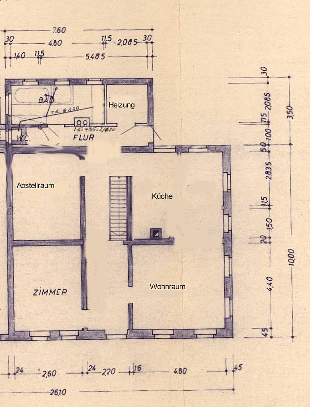 In diesem Haus ist die große helle WohnKüche mit SeitenAusgang zum Freisitz das Zentrum. Gegenüber der Küche befindet sich ein GästeZimmer. Im NordAnbau ist das kleine, gemütliche Bad untergebracht. Unter der Küche befindet sich eine TeilunterKellerung, die zwar nur 1,60m hoch ist, sich aber durch die NatursteinMauerung gut als Wein- und GemüseKeller eignet.