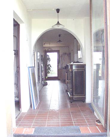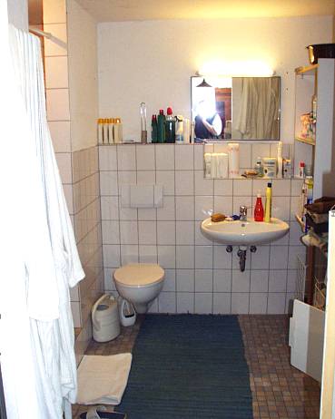 Plan des Erdgeschosses. Das Haus ist ca. 14 m breit und 10 m tief. Der vordere und linke Teil wird zur Zeit noch als Atelier- und ArbeitsRaum genutzt, im hinteren Teil Sauna, HeizZentrale, Wäschehänge, im großen Badezimmer Waschmaschine, Trockner, Waschbecken, Toilette und große SaunaDusche mit Schwallbrausen etc.. Das ÖlLager links bildet das "Scharnier" zum Garagen- und WerkstattAnbau. Es können 8000 Liter Öl in 4 Tanks "gebunkert" werden, sodass das Haus bis zu 4 Jahre versorgt ist und der Öleinkauf nach Preislage erfolgen kann. Das Haus verfügt zusätzlich über einen zentralen Kachelofen und im OberGeschoss über einen offenen Kaminofen, der exzellent brennt (nicht immer üblich). Das Haus hat 3 separate Schornsteine. |