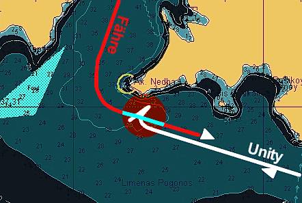 21. Mai 2004 * Aegina Hafen * Insel Aegina * Die Fahrt hierher begann sehr unangenehm. Wir verließen den Hafen von Poros am 19. Mai um 9:50 und querten die an den Hafen anschließende Bucht mit Kurs auf die Meerenge, die sich Richtung Aegina öffnet. Als wir fast am Leuchtfeuer waren, das den Eingang zur Durchfahrt markiert, kam eine riesige Fähre mit so großer Geschwindigkeit aus der Durchfahrt, dass sie sich bei einem extremen Kurswechsel in Richtung Poros bedenklich zur Seite legte. Da wir uns auf geradem Kurs vom Hafen zur Durchfahrt bewegten, konnten wir davon ausgehen, dass die Fähre, wie es die allgemeinsten und grundsätzlichsten Regeln der Seefahrt vorschreiben, an unserer linken Seite passieren würde. Dann passierte etwas, für das es verschiedene Erklärungen gibt, nur keine gute. Das Schiff drehte immer stärker in unsere Richtung. Also wichen wir immer mehr nach rechts aus, auch wenn wir damit näher ans Land kamen, als uns lieb war. Gleichzeitig kam das Riesenschiff in der Höhe eines zehnstöckigen Hauses mit höchster Geschwindigkeit näher - alles passierte in Minutenschnelle. Wir wichen immer mehr nach rechts aus, die Fähre folgte unserer Drehung mit dem Bug so schnell, dass wir zuletzt, als das Schiff nur noch wenige Meter vor uns aufragte, mit voller Kraft im rechten Winkel weg von der Fähre flohen. Hätten wir keinen starken Motor mit 80 PS gehabt, wären wir unweigerlich von dem Schiff überrollt worden. Gesehen wurden wir offensichtlich, hoch oben auf der Brücke stand deutlich sichtbar ein Offizier an der Fensterfront. Nachdem uns die Fähre im Abstand von wenigen Metern passiert hatte, konnte wir gerade noch eine Drehung von ca. 150 Grad fahren, um unseren Bug gegen die aus nächster Nähe anrollende riesige Bugwelle des Riesenschiffs von über 2m Höhe zu stellen. Erklärungsversuche: 1. Der Autopilot oder die Steuerung der Fähre spielte verrückt (darf eigentlich nicht vorkommen und sollte ggf. sofort per Handsteuerung korrigiert werden), 2. Der Kapitän kennt die elementarsten Seefahrtsregeln nicht, 3. Die gelangweilten Offiziere erlaubten sich ein "Späßchen" mit einer Yacht (das ganz knapp an einem für uns mit größter Sicherheit tödlichen Desaster vorbeiging), 4. Der Autopilot der Fähre war auf einen viel zu nahen Kurs zum Land programmiert, um entgegenkommenden Schiffen ein genügendes Freihalten vom Land zu erlauben und die Besatzung sah, auch als augenscheinlich unser Leben bedroht war, keinen Grund, eine Korrektur am Kurs vorzunehmen. Aus den Erfahrungen unserer bisherigen Reisen neige ich nach vielen negativen Erlebnissen dazu, viele Skipper von Motoryachten in ihrem Verhalten auf See und im Hafen als allgemeingefährlich und extrem unseemännisch einzustufen (pardon - aber das allgemeine Verhalten lässt oft keinen anderen Schluss zu). Augenscheinlich potenziert sich das mit der Größe des motorgetriebenen Wasserfahrzeugs zu mörderischen Perversen ohne die geringsten Skrupel. Wir werden diesen Vorfall wahrscheinlich offiziell zu Protokoll geben, da wir mit der Besatzung der Cats, die ca. eine halbe Seemeile hinter uns fuhr, exzellente Zeugen haben, die den Vorgang bis ins Detail genau beobachtet haben. (Grafik des Ablaufs)