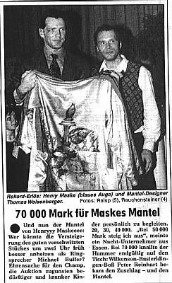 Erst wenige Tage vor dem Kampf am vergangenen Samstag wurde der Mantel fertig. Mittlerweile wurde er für 70000 Mark versteigert. Das Geld will Henry Maske notleidenden Kindern zukommen lassen. Verdient hat Thomas Weisenberger daran nichts.