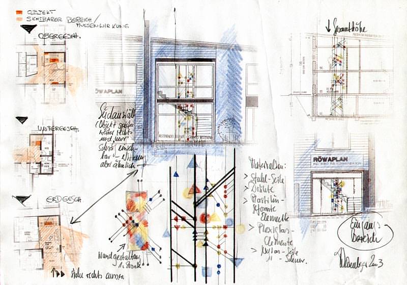 On the left side: Plans from which sides the sculpture and the paintings can be seen. In the middle and righthand: form and position in the staircase on the three floors and sights to the entrance from outside the building. |