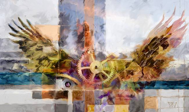 singing in the dead of night Auf Nachfrage einer Kollegin habe ich ein paar Überlegungen zur Bildkomposition, Umsetzung und Technik zusammen gefasst: Die hauptsächlichen "Botschaften" im Bild sind schnell aufgezählt: 1. "the dead of night" findet sich im rosa-hellblauen Morgenhimmel mit noch schwarzen "Nachtwolken", wie er hier am Meer oft zu sehen ist. (dazu dann auch das halb "nacht-dunkle" Meer) 2. "waiting for this moment...": das Befreien aus dem (Uhr-)Räderwerk der Zeit, 3. die (noch?) "unkonkreten" etwas blassen Ideen als Basis auf dem der "Arise" aufbaut. Das war auch schon das Grundlegende (dass die Farbe Grün als Farbe der Hoffnung auftaucht etcetcetc - darf sich jeder selbst auspusseln). Technik: manchmal male ich Teile des Bildes "analog" und baue dann auf dem Scan auf (oder füge analoge Teile ein). Ansonsten: kein Photoshop, sondern vier andere Programme (wie immer: jedes kann was, das das andere nicht oder nicht so gut kann - teilweise sind das Programme, die es längst nicht mehr gibt, die aber (zumindest für meine Ansprüche) besser sind als vieles, das uns als "letzter Schrei" verkauft wird). Daraus habe ich mir einige Arbeitsgeräte "geschnitzt", die meiner Arbeitsweise entgegenkommen. Effekte nutze ich *keine* - nichts nutzt sich schneller ab. Alles Handwerk (wie im richtigen Leben...). Für alle, die das Lied nicht kennen oder noch einmal anhören wollen, hier die ziemlich "coole" Interpretation dreier älterer Herren (*nicht* die Beatles): http://youtu.be/wORwlCy3JDI |