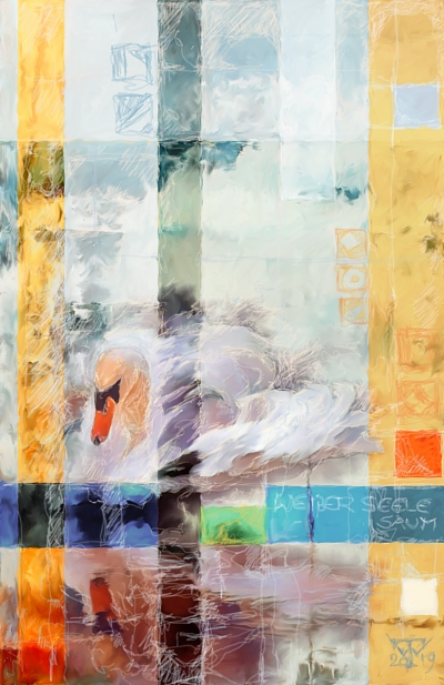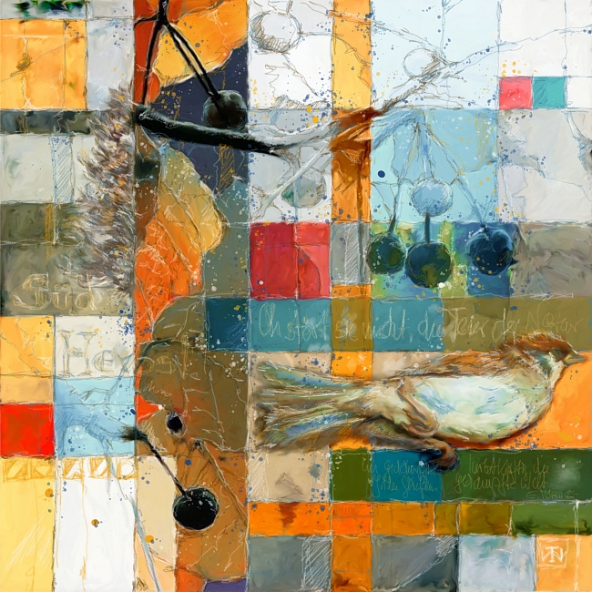 x 120 cm. Das Bild ist auch ein Epitaph auf einen kleinen Sperling, den ich in unserem Garten gefunden habe: ganz bewusst in mein Bild aufgenommen als Erinnerung daran, dass selbst der Bestand dieser so weit verbreiteten Spezies in den letzten Jahren um ca. 50% abgenommen hat. Zur Technik: ich habe nun bereits einige Jahre damit verbracht, diese neue Technik zu entwickeln, in der ich meine "klassische" Arbeitsweise in neue Gestaltungsmöglichkeiten "importiert" habe. Die Arbeitsweise ist deutlich komplexer und stellt hohe Anforderungen auch an Komposition und Gestaltung. Wichtig weiterhin: gutes Handwerk. Als Ausweis der Achtung vor meinem Thema und dem Betrachter meiner Bilder: schau her, ich gebe mir gerne "Mühe", um dir etwas zu zeigen.