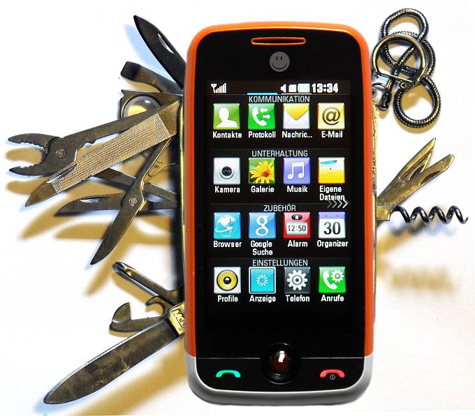 (M)ein "Tweet" vom 26.03.2011, 12.00 Uhr: "Männerspielzeug "Allzweckwaffe": früher waren "Handys" rot mit weißem Kreuz + 21 Klingen, heute sind sie schwarz, "Eifohn" + 53 Apps. So what?" |